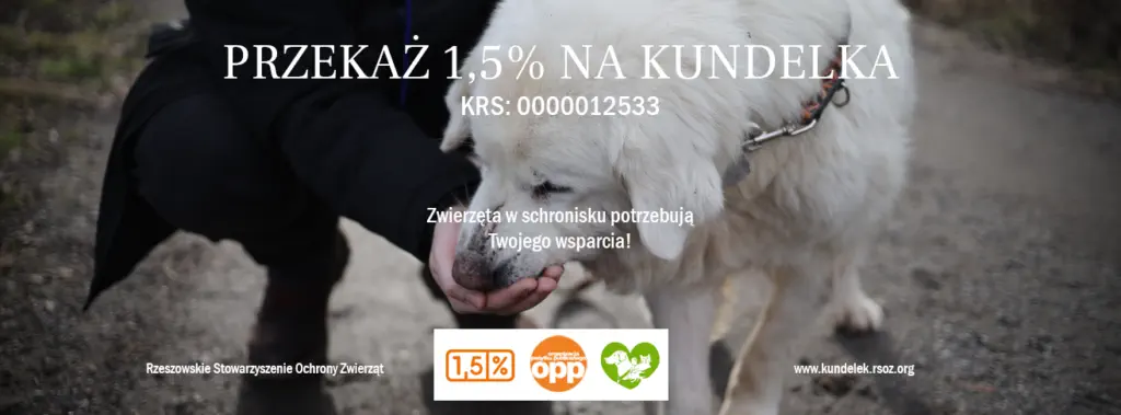 Zachęcamy do zapoznania się z naszą działalnością i przekazanie 1,5% podatku na rzecz Rzeszowskiego Stowarzyszenia Ochrony Zwierząt, prowadzącego schronisko Kundelek.